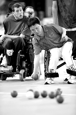 昨日,45歲的王義和他的隊(duì)友們在北京殘奧會硬地滾球項(xiàng)目中亮相。這是中國運(yùn)動員首次參加這個(gè)項(xiàng)目的殘奧會比賽。