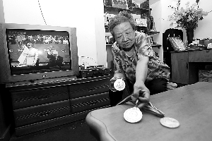 昨日,賈大媽在家展示王義在硬地滾球比賽中獲得的獎(jiǎng)牌。本報(bào)記者 韓萌 攝