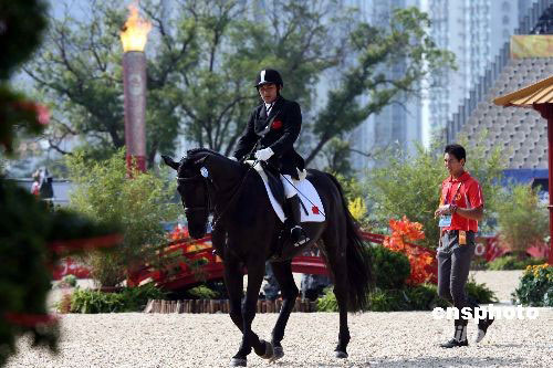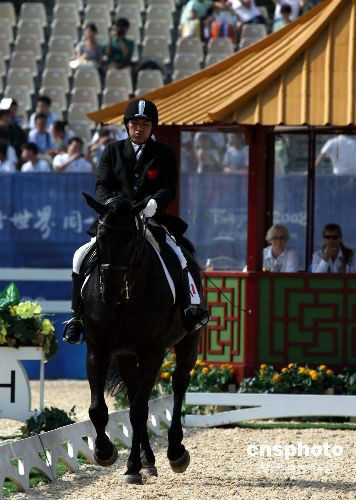 九月八日上午,殘奧會馬術(shù)賽在香港沙田賽場進(jìn)行盛裝舞步團(tuán)體賽,中國唯一的參賽選手彭裕蓮輕駕坐騎“黑亮亮”出場。中新社發(fā) 洪少葵 攝