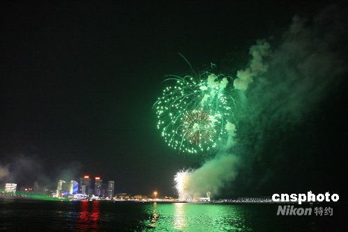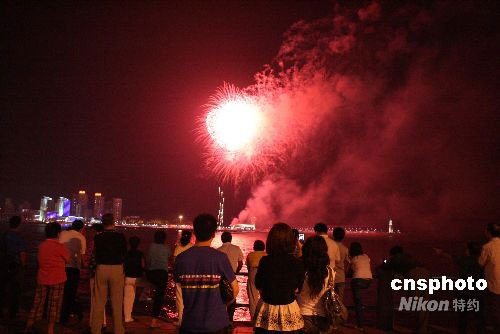 9月7日晚,殘奧會帆船賽啟動儀式在青島奧林匹克帆船中心主題公園舉行,眾多市民和游客在五四廣場及音樂廣場觀看焰火。當晚,青島街頭燈火輝煌、流光溢彩。中新社發(fā) 尤中原 攝