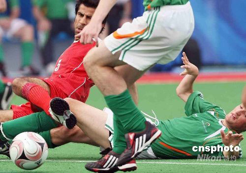 北京殘奧會(huì)七人制(男子)足球比賽9月8日在北京奧林匹克公園內(nèi)的橄欖球場(chǎng)開賽,伊朗隊(duì)以4比2擊敗愛(ài)爾蘭隊(duì)。圖為伊朗隊(duì)5號(hào)哈迪·薩法理(紅)拼死防守愛(ài)爾蘭隊(duì)的最后進(jìn)攻。殘奧會(huì)七人制(男子)足球比賽在橄欖球賽場(chǎng)舉行,全場(chǎng)共60分鐘,隊(duì)員為腦癱患者。 中新社發(fā) 任晨鳴 攝