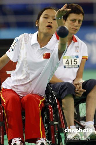 9月8日,北京殘奧會硬地滾球混合單打-BC4級小組循環(huán)賽中,中國選手戚翠芳以8比3的比分戰(zhàn)勝巴西選手桑托斯,順利晉級四分之一決賽。 中新社發(fā) 杜洋 攝