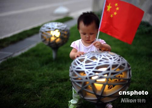 9月8日,北京正在舉辦殘奧會(huì)的國(guó)家體育場(chǎng)外,一位可愛的小朋友往“鳥巢路燈”上插國(guó)旗。中新社發(fā) 廖攀 攝