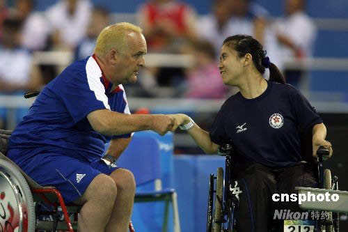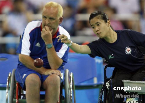 9月9日,中國香港選手郭海瑩在硬地滾球混合單打-BC2決賽中,戰(zhàn)勝英國選手奈杰爾-莫里,為中國香港隊(duì)摘得殘奧會(huì)首枚金牌。中新社發(fā) 杜洋 攝