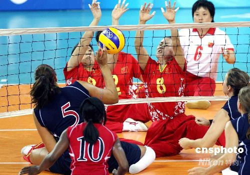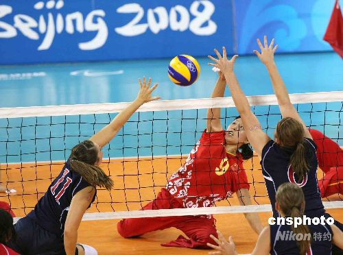 北京殘奧會(huì)坐式排球9月9日晚繼續(xù)在北京的中國農(nóng)業(yè)大學(xué)體育館舉行,雅典殘奧會(huì)冠軍中國女隊(duì)以3比0完勝美國隊(duì)。中新社發(fā) 任晨鳴 攝