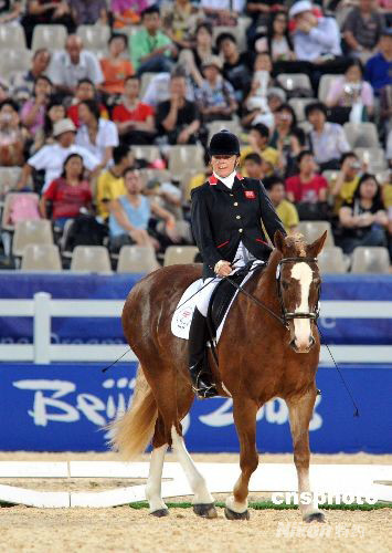 九月九日晚,在香港殘奧馬術(shù)“盛裝舞步團體賽”個人錦標賽級別Ia,英國選手安妮·鄧納姆策騎馬匹“特迪”表現(xiàn)出色,奪得金牌。為期五天的北京殘奧會馬術(shù)項目,有來自二十八個國家和地區(qū)的七十三名選手及七十一匹參賽馬匹角逐十一枚金牌,參賽國家和地區(qū)數(shù)目、選手和馬匹數(shù)目都創(chuàng)歷史記錄。 中新社發(fā) 鄧慶樂 攝