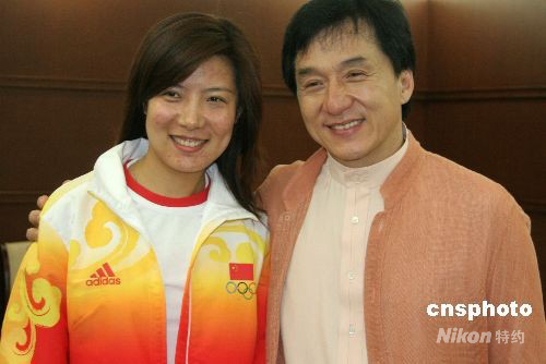 九月九日,北京奧運(yùn)金牌得主杜麗與國際巨星成龍在國家體育總局相聚并合影留念。當(dāng)晚,香港演藝界大鱷、楊受成慈善基金創(chuàng)立人楊受成出資一千二百六十萬元人民幣,用以獎勵在北京奧運(yùn)會上獲得金牌的中國內(nèi)地運(yùn)動員。 中新社發(fā) 孫自法 攝