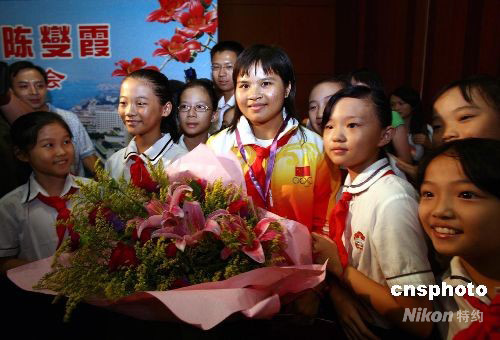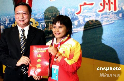 2008年9月10下午,共青團廣州市委舉辦的奧運冠軍陳燮霞廣州座談會上在廣州白云國際會議中心舉行,廣州市十佳少先隊員代表和廣州奧運志愿者代表與在2008北京奧運會上奪得首金的舉重冠軍陳燮霞“零距離”面對面,傾聽她的奧運冠軍故事。在這個座談會上,陳燮霞正式注冊成為0000001號廣州亞運會志愿者,并向全市青年倡議“創(chuàng)建文明城市 支持廣州亞運會”。 中新社發(fā) 夏世焱 攝