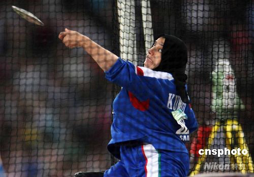 9月10日晚,北京殘奧會(huì)田徑各項(xiàng)比賽繼續(xù)在北京奧林匹克公園內(nèi)的國(guó)家體育場(chǎng)-鳥巢舉行,各國(guó)女子大力士在鐵餅比賽中竭盡全力向冠軍發(fā)起沖擊。圖為頭戴黑色頭巾的科威特選手瑪哈·謝拉揚(yáng)奮力將鐵餅擲出。 中新社發(fā) 任晨鳴 攝