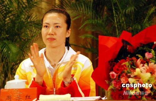 圖:中國(guó)女排隊(duì)員周蘇紅在報(bào)告會(huì)上發(fā)言