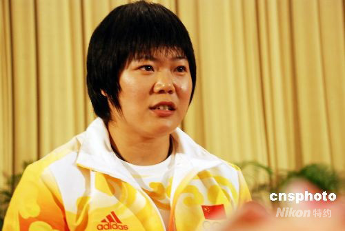 圖:奧運(yùn)女子舉重冠軍劉春紅在報(bào)告會(huì)上發(fā)言