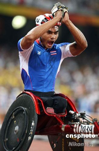 9月11日晚,北京殘奧會田徑比賽繼續(xù)在奧林匹克公園內(nèi)的國家體育場“鳥巢”舉行,在男子5000米-T54級決賽中,泰國選手巴越·沃霍倫一路領(lǐng)先,并在最后時刻頂住各路選手的反撲,在這個一直被歐美強手統(tǒng)治的項目中奪得冠軍。中新社發(fā) 任晨鳴 攝