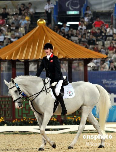 九月十一日晚,來(lái)自英國(guó)的選手索菲-克里斯琴森在香港殘奧馬術(shù)盛裝舞步“個(gè)人自選動(dòng)作科目-級(jí)別Ia”上獲得金牌。圖為索菲-克里斯琴森策騎馬匹“朗布魯斯科三世”在比賽中。 中新社發(fā) 鄧慶樂(lè) 攝