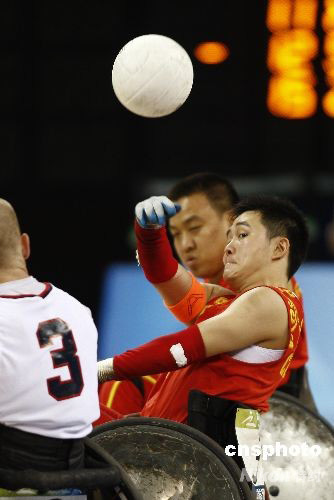 9月12日,北京殘奧會輪椅橄欖球展開首日比賽,東道主中國隊(duì)以30比65的比分不敵美國隊(duì)。 中新社發(fā) 杜洋 攝