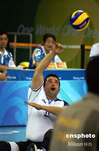 2008年9月12日,在北京殘奧會男子坐式排球半決賽中,波黑隊(duì)以3比0戰(zhàn)勝埃及隊(duì),進(jìn)入決賽。 雙方隊(duì)員發(fā)球都好似舞蹈。中新社發(fā) 馬小剛 攝