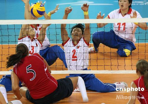 9月14日晚,北京殘奧會坐式女排決賽在北京的中國農(nóng)業(yè)大學(xué)體育館舉行,雅典殘奧會冠軍中國隊以3:0戰(zhàn)勝美國隊蟬聯(lián)冠軍。 中新社發(fā) 任晨鳴 攝
