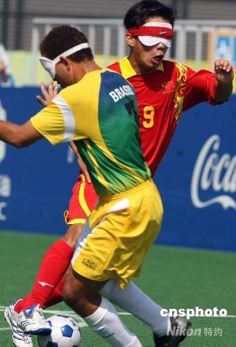 9月15日下午,北京殘奧會(huì)五人制(盲人)足球預(yù)賽最后一輪比賽在北京奧林匹克公園內(nèi)的橄欖球場(chǎng)舉行,此前均保持全勝紀(jì)錄的中國(guó)隊(duì)與巴西隊(duì)相遇,巴西隊(duì)10號(hào)里卡多·阿爾維斯率先攻破中國(guó)隊(duì)大門(mén);中國(guó)隊(duì)9號(hào)隊(duì)長(zhǎng)王周彬下半時(shí)破門(mén)得分。最終雙方以1比1戰(zhàn)平,攜手晉級(jí)決賽。中新社發(fā) 任晨鳴 攝
