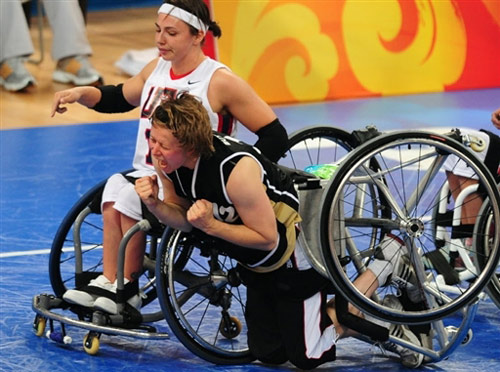 9月8日,在北京殘奧會女子輪椅籃球A組預(yù)賽中,美國隊最終以42:38艱難逆轉(zhuǎn)德國隊。圖為德國隊的瑪倫·巴特布羅特在裁判判罰美國隊斯蒂芬妮·惠勒犯規(guī)后,興奮吶喊。