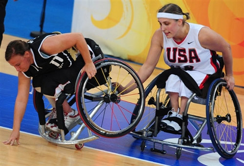殘奧會輪椅籃球賽,德國隊對美國隊的比賽中,美國隊的球員克里斯蒂娜·里普幫助跌倒的德國隊隊員諾拉·施拉茨。
