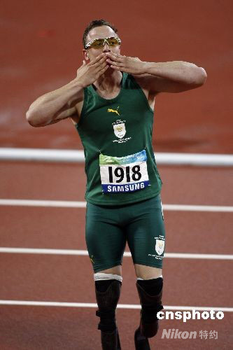 9月16日,北京殘奧會(huì)男子400米T44決賽,南非的“刀鋒戰(zhàn)士”皮斯特瑞斯以47秒49的成績打破世界紀(jì)錄,奪得個(gè)人在本屆殘奧會(huì)短跑項(xiàng)目上的第三塊金牌。 中新社發(fā) 杜洋 攝