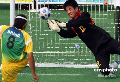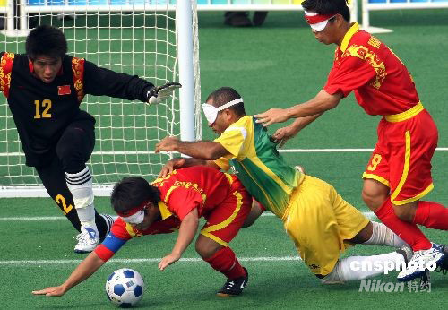 9月17日下午,北京殘奧會(huì)五人制足球決賽在北京奧林匹克公園內(nèi)舉行,雅典殘奧會(huì)冠軍巴西隊(duì)依靠強(qiáng)大的實(shí)力,最后以2比1擊敗中國隊(duì)蟬聯(lián)冠軍。中新社發(fā) 任晨鳴 攝