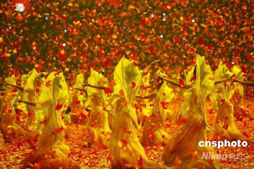 圖為文藝演出中紅葉紛紛從頂端飄落。 中新社發(fā) 杜洋 攝