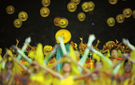 “歡慶篇章”是整臺(tái)晚會(huì)“寄給未來的一封信”的壓軸戲,而“草帽舞”是“歡慶”中的高潮部分、晚會(huì)的亮點(diǎn)之一。昨晚草帽舞華麗登場(chǎng)時(shí),成都的姑娘們從舞臺(tái)的左臺(tái)口向舞臺(tái)的右底角走“斜線一字”,動(dòng)作整齊,節(jié)奏分明,邊行進(jìn)邊傳遞草帽,她們的隊(duì)列沉穩(wěn)舒緩,時(shí)圓時(shí)方,變化萬千。到達(dá)鳥巢中間時(shí),草帽突然像金色的花朵,從演員手中快速飛出,在空中彼此飛舞,宛如向日葵花簇簇綻放,蔚為壯觀。而在草帽舞隊(duì)的四周,還有兩千多人輔以奔放灑脫的舞蹈表演。此時(shí)鳥巢內(nèi)已是掌聲雷動(dòng),歡呼陣陣。整個(gè)節(jié)目傳遞的是青春、是快樂,是少女的激情與奔放,是自由與陽光,是未來的希望,表演服飾也以紅黃為主調(diào),大紅艷麗,大黃成熟,直奔?xì)g慶主題。成都的姑娘們退場(chǎng)后激動(dòng)地說,她們的自信和當(dāng)晚的演出成功,離不開奧組委領(lǐng)導(dǎo)的關(guān)心支持。據(jù)悉,這批專業(yè)演員全部由成都市文化藝術(shù)學(xué)校的專業(yè)舞蹈學(xué)生、演員和舞蹈教師組成。(周帥)