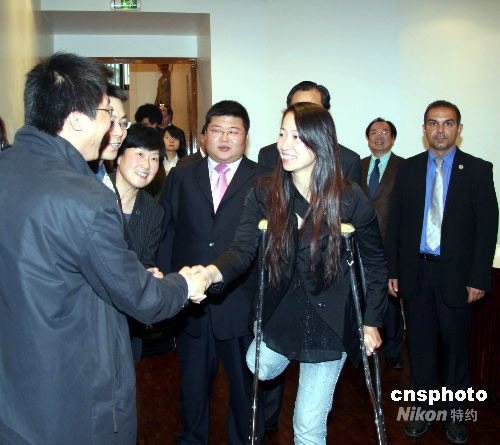 十九日晚,曾與中國(guó)奧運(yùn)火炬手金晶結(jié)下“戰(zhàn)斗友誼”的旅法華僑華人和中國(guó)留學(xué)生在巴黎舉行歡迎會(huì),以掌聲和親情迎接金晶重返巴黎,訪問法國(guó)。圖為金晶與部分一同參與北京奧運(yùn)火炬巴黎傳遞的華人與留學(xué)生火炬手、護(hù)衛(wèi)手等“老戰(zhàn)友”喜重逢。中新社發(fā) 吳衛(wèi)中 攝
