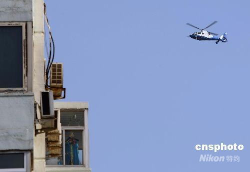 圖:直升機盤旋北京上空實時直播奧運男子馬拉松賽事