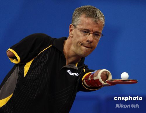 圖:德國(guó)無(wú)手選手萊納獲得乒乓球M6第四名