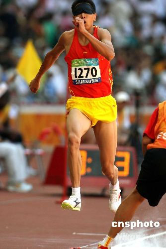 圖:中國(guó)盲人選手李端獲三級(jí)跳遠(yuǎn)冠軍