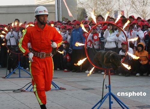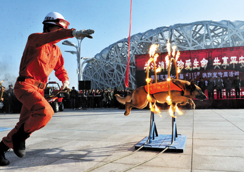 圖:“鳥(niǎo)巢”前消防犬亮絕活