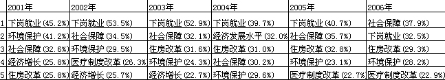 表:2001年~2006年城市居民關(guān)注的國(guó)內(nèi)社會(huì)熱點(diǎn)問(wèn)題(前5位)