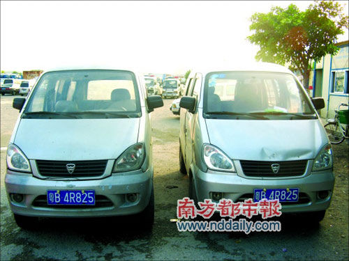 昨天下午4點(diǎn)鐘,羅湖交警大隊(duì)西嶺下扣車場(chǎng),丁先生的車和套牌車停在一角!斑@簡(jiǎn)直就是孿生的嘛”,一位車場(chǎng)工作人員這樣說,兩輛車同為哈飛面包車,車型完全相同,顏色同為銀灰色。