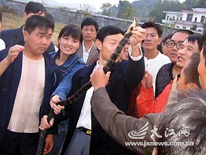10月16日,本報(bào)(注:江南都市報(bào))記者赴宜春向蛇王老黃拜師學(xué)藝,既感受了隨蛇王體驗(yàn)抓毒蛇時(shí)的心驚膽戰(zhàn),也聽到了蛇王驚心動(dòng)魄的歷險(xiǎn)故事。