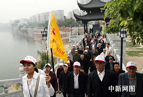 中新網(wǎng)長沙10月19日電(王永華)今天是農(nóng)歷的九月初九,中華民族傳統(tǒng)的重陽佳節(jié)。為歡度重陽節(jié),湖南衡陽市今天主辦了千名老人游雁城活動。上午,千名老人頭戴統(tǒng)一的遮陽帽,分乘30輛大巴分別向陸家新屋、湘聯(lián)學聯(lián)、湖湘文化館、石鼓書院等6個景點參觀。