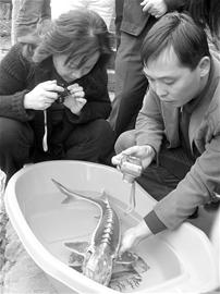 當(dāng)?shù)貪O政管理部門和水產(chǎn)保護大隊工作人員迅速趕到,經(jīng)觀察,初步認(rèn)定該魚是和中華鱘一樣珍貴的國家一級保護野生動物達(dá)氏鱘,遂將該魚送到躉船漁艙喂養(yǎng),請有關(guān)專家作進一步鑒定。