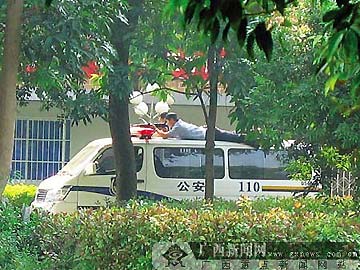 稍后,兩持槍民警伏身在一輛警車車頂,警車緩緩向樹林靠近。擔心水牛突然“發(fā)飆”,警車移動不了幾米便停下來。短短二三十米路程,警車用了約20分鐘。到距離水牛約10米遠處,警車停了下來。