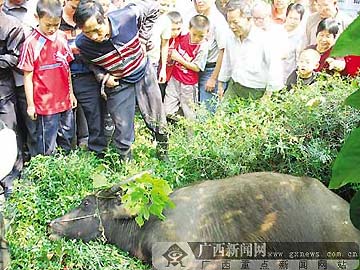 10月21日,一頭水牛被牽進南寧市明秀西路細新巷時,受驚奔走,接連撞倒1男3女后,竄進了南寧市第八人民醫(yī)院內一片樹林里。上午10時47分,一聲槍響,水牛被民警擊斃。