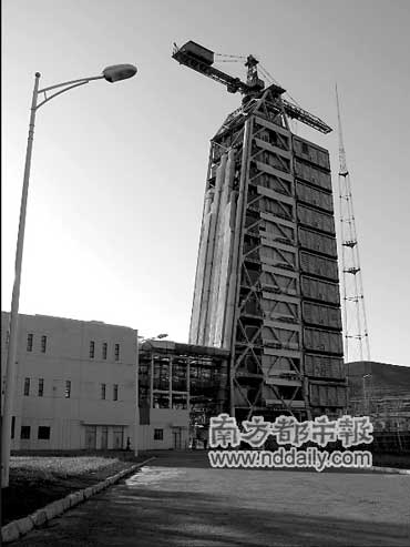 站到中心的發(fā)射塔的11層平臺(tái)上,正好可以看清對(duì)面山頂?shù)墓欧榛鹋_(tái),據(jù)說(shuō)那是楊家將的遺址。夕陽(yáng)眩光中的古老烽燧,長(zhǎng)空下線條精確的火箭發(fā)射塔,兩個(gè)時(shí)代的軍事圖騰之間,似乎注定了某種因緣。