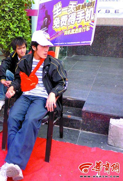 兩位 “靜坐者”的這一行為不時(shí)引來路人的注意和評論。兩人在“坐等”免費(fèi)手機(jī)的同時(shí),也成為了商家的活宣傳廣告。(記者 寧峰攝影報(bào)道)
