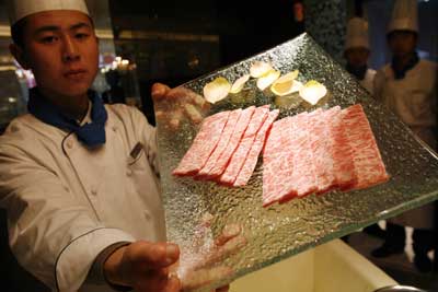 據(jù)該店廚房經(jīng)理任先生介紹,他們所銷售的肉品分為國產(chǎn)的和進口的兩種。其中,“日式降霜肥!焙汀叭帐街磷鸱逝!边@兩道售價較高的特色菜所采用的原料為日本進口牛肉,每份售價分別為688元和578元。