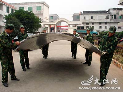 24日18時(shí)05分,中國(guó)第一顆探月衛(wèi)星“嫦娥一號(hào)”成功發(fā)射升空后,西昌衛(wèi)星發(fā)射中心致函廣東韶關(guān)市和江西贛州市,要求做好運(yùn)載火箭整流罩殘骸落點(diǎn)標(biāo)點(diǎn)和回收工作,并做好落區(qū)群眾的宣傳和防護(hù)等善后工作。殘骸的一部分28日在廣東始興縣發(fā)現(xiàn)回收后,30日,飄落于江西全南縣南逕鎮(zhèn)的另一部分長(zhǎng)約4米,寬約1.5米左右的整流罩殘骸被全南縣人武部成功回收。