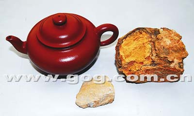 為了證實(shí)此壺真?zhèn),王順發(fā)還專門贈送駱先生制壺原礦兩塊(見圖),同時(shí)在收藏證中提到并以此為證。在上?萍汲霭嫔绯霭娴摹蹲仙皦罔b賞寶典》一書中記者看到,圖中大塊的原礦叫石黃心,小塊的叫大紅泥礦,兩者按照一定比例混合則成大紅袍泥,此泥產(chǎn)于宜興市黃龍山,泥質(zhì)細(xì)膩密度大,屬十分稀有泥類,是制宜興紫砂壺頂級泥料。
