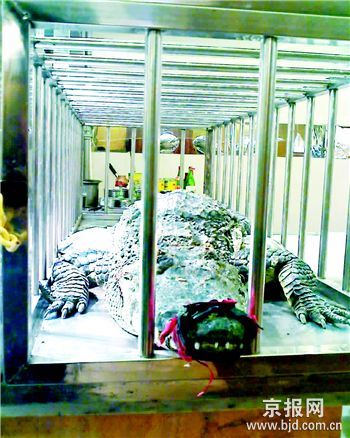 昨晚7時(shí),記者來(lái)到位于魏公村的美洲島國(guó)際美食中心,在餐臺(tái)盡頭的中餐區(qū),一只長(zhǎng)約160厘米、寬80厘米的鐵籠子隱藏在食物中間,一只身長(zhǎng)約1.7米的鱷魚(yú)一動(dòng)不動(dòng)地趴在里面,顯得毫無(wú)生氣。鱷魚(yú)的尾巴蜷縮起來(lái),眼睛緊閉,大嘴被一圈圈紅布綁得緊緊的。鱷魚(yú)兩旁趴著兩只大草龜,正努力地想往鱷魚(yú)背上爬。