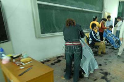 記者來到該校多媒體教室時(shí),看見理發(fā)師正在給學(xué)生理發(fā),幾名男生坐在椅子上扭動(dòng)著身體,露出極不情愿的表情。一會(huì)兒,幾名男生陸續(xù)剪好頭發(fā),每人交了3塊錢走出教室。