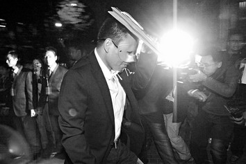 林肯車停下后,先是戴著面具的美女們從白色林肯車內(nèi)鉆出,鎂光燈、閃光燈鋪天蓋地地“罩”下來(lái),她們低著頭一一走過(guò)“星光大道”,一位美女踩著高跟鞋的步伐有些不穩(wěn)。相較美女從容的表現(xiàn),富豪們則要羞澀得多,幾乎過(guò)半的富豪都利用某網(wǎng)站分發(fā)的包裝袋,或頂在頭上,或用來(lái)掩面,“溜”也似的小跑入內(nèi)。