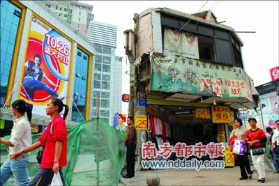 本月9日開(kāi)始,一篇題為《長(zhǎng)沙最牛釘子戶三年未拆除》的帖子開(kāi)始在網(wǎng)上各大論壇流傳,將默默挺立了三年的三顆“釘子”擺到了人們眼前:一座全新裝修、開(kāi)業(yè)不久的商場(chǎng)大樓,門(mén)前廣場(chǎng)靠馬路邊處,則是相距不遠(yuǎn)一字排開(kāi)的三座破舊房屋。