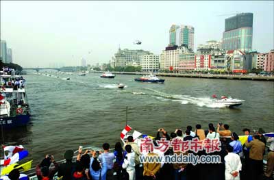 疑犯開著快艇一路狂逃,半路將人質(zhì)踹入水中;警方救人、擒賊、打撈物證,十幾分鐘內(nèi)全部完成。昨天,走過百余年歷史、默默守護珠江的廣州水警由幕后走向前臺!鞍倌晁賱(chuàng)輝煌”2007年廣州警察開放日活動在濱江西路水警碼頭和人民橋至解放大橋之間的珠江河面舉行。廣州水警向萬名圍觀市民演示了水上反劫持抓捕行動。這是第六屆廣州“警察開放日”活動的重頭戲。此外,水上表演還包含消防船表演、飛行表演等多個項目。