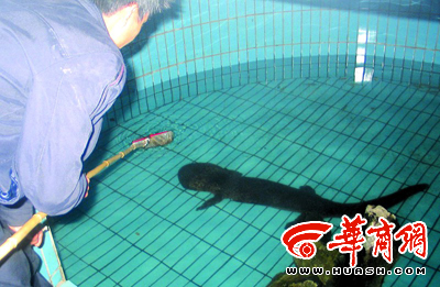 今年,漢中賓館破產(chǎn)拆遷,賓館和漢臺區(qū)旅游局的人將巨型娃娃魚寄養(yǎng)到了興元湖公園的動物園。動物園專門為它準備了一個水池,并進行了消毒和水質(zhì)檢測。這條娃娃魚據(jù)估計已有40多歲,目前身體健康。(記者 衛(wèi)曉寧)